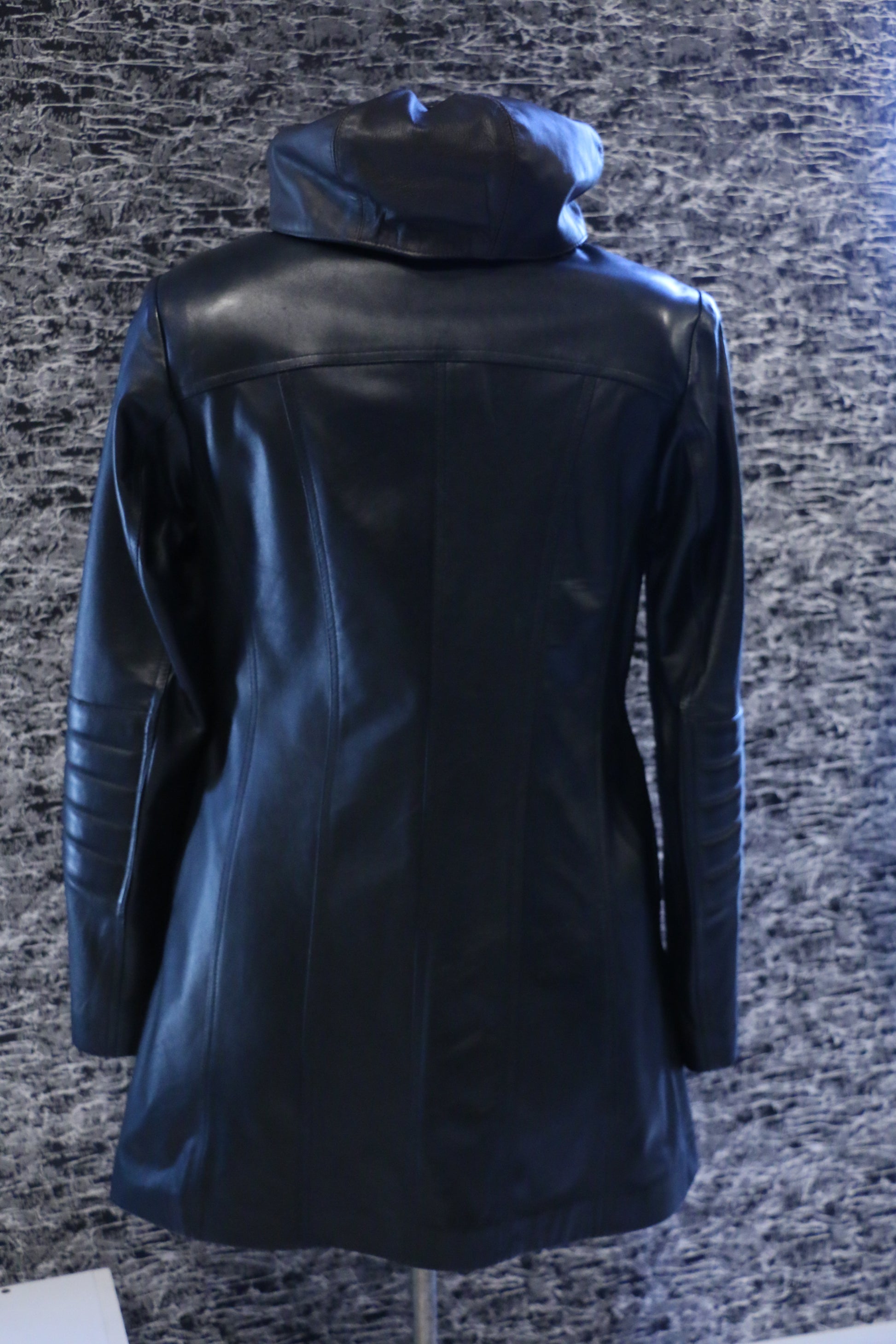 A modern, streamlined leather jacket featuring a full-front zipper, elegant panel stitching, and a stylish hood. Perfect for women who want comfort, confidence, and a chic everyday outerwear piece.